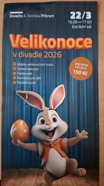Dne 22.03.2026 si děti užily úžasný den na akci s názvem „Velikonoce v divadle Příbram“. Pod patronátem hejtmanky Středočeského kraje paní Petry Peckové, se děti pustily do tvoření velikonočních ozdob, navštívily kino, zahrály si spoustu her a čekala je hromada bohatých svačinek a výborný oběd s překvapením!